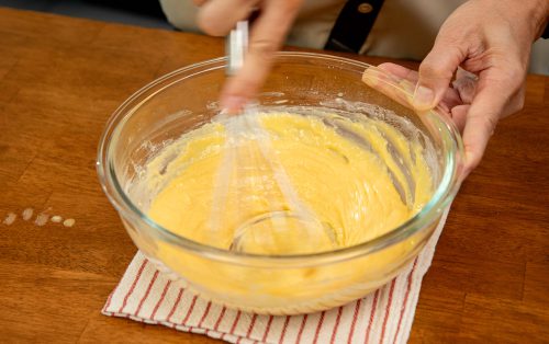 3.แยกไข่แดงและไข่ขาว ตีไข่แดงกับน้ำตาลทราย (1) ให้ละลาย ใส่น้ำมันรำข้าว และนมสด ผสมให้เข้ากันดี ร่อนแป้งเค้ก ผงฟู และเกลือใส่ลงในส่วนผสมไข่แดง คนให้เข้ากันจนเนียน พักไว้
