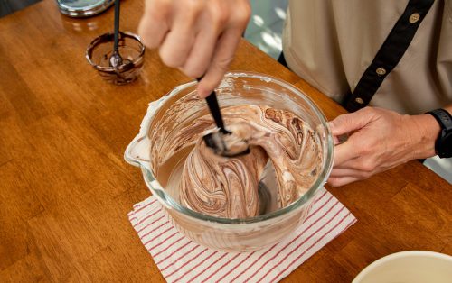 6.ตักส่วนผสมเค้กที่เหลือเล็กน้อยลงไปผสมกับส่วนผสมโกโก้ คนให้ส่วนผสมเบาขึ้น จากนั้นนำไปผสมกลับกับส่วนผสมเค้กที่เหลือทั้งหมด ตะล่อมให้เข้ากัน