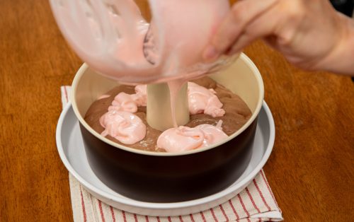 7.ใส่ส่วนผสมเค้กรสโกโก้และส่วนผสมกลิ่นกุหลาบลงในพิมพ์ ในลักษณะสลับกัน เพื่อให้เกิดลายหินอ่อน เคาะพิมพ์เบา ๆ แล้วนำเข้าอบประมาณ 50 นาที หรือจนเค้กสุกดี