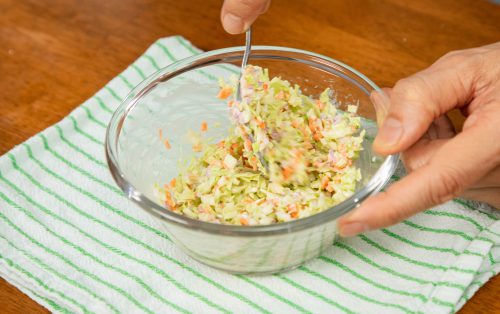 1.เตรียมโคลสลอร์ โดยผสมกะหล่ำปลี แครอท หอมแดง และมายองเนสให้เข้ากัน พักไว้ในตู้เย็น