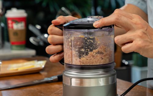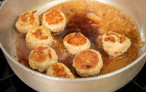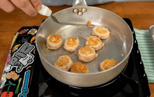 2.ทำลูกชิ้นไก่ โดยบดสะโพกไก่ ก้นขนมปัง นมสด โชยุ ก้านต้นหอมญี่ปุ่น และแป้งข้าวโพดให้เนียนเข้ากัน ชั่งและแบ่งส่วนผสมเป็น 8 ส่วนเท่า ๆ กัน ใช้มือชุบน้ำปั้นเป็นก้อนกลมแบน