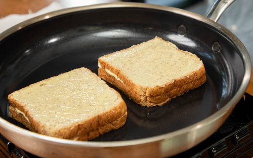 5.ทำกริลล์ชีสแซนด์วิช โดยทาเนยบนขนมปัง วางเชดด้าชีสตรงกลาง ประกบเป็นแซนด์วิช ตั้งกระทะแล้วนำไปจี่จนขนมปังกรอบและชีสละลาย