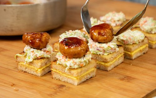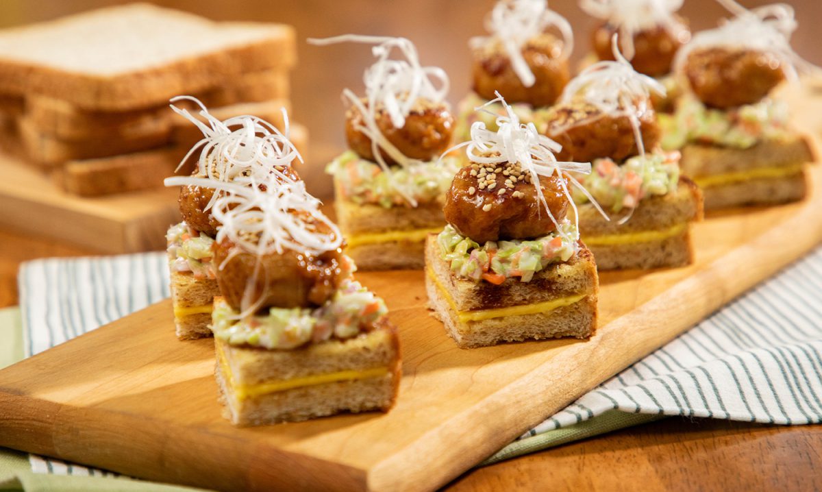 6.Trim off the crusts and cut each sandwich into four pieces. Top each piece with coleslaw, followed by a teriyaki chicken tsukune.