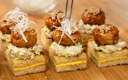 Mini Grilled Cheese with Teriyaki Chicken Tsukune (มินิกริลล์ชีสหน้าไก่สึคุเนะเทริยากิ)