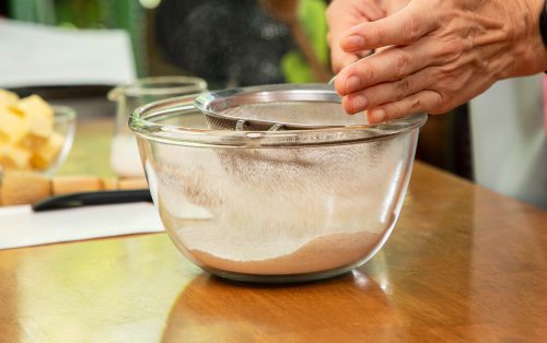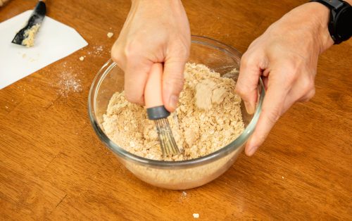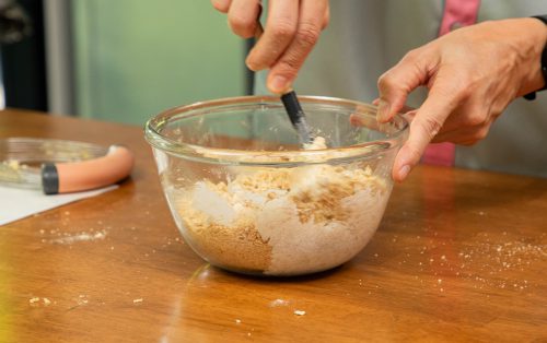 1.ร่อนแป้งสาลีอเนกประสงค์ ผงฟู และเกลือเข้าด้วยกัน ใส่แป้งสาลีโฮลวีต น้ำตาลทราย และโรลโอ๊ต จากนั้นคนให้ส่วนผสมแห้งทั้งหมดกระจายทั่วดี