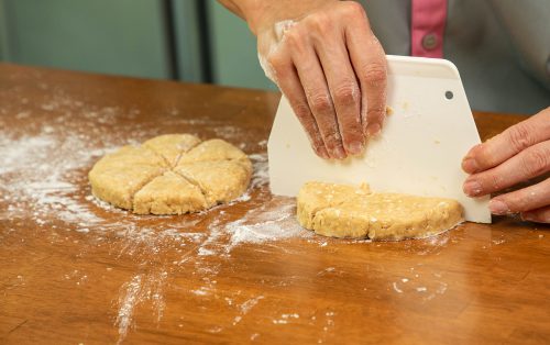 4.โรยแป้งบาง ๆ บนโต๊ะ ทำแป้งแต่ละส่วนให้เป็นก้อนกลมหนาประมาณ 2 เซนติเมตร จากนั้นหั่นเป็น 6 ชิ้นเท่า ๆ กัน ทำซ้ำกับอีกก้อน