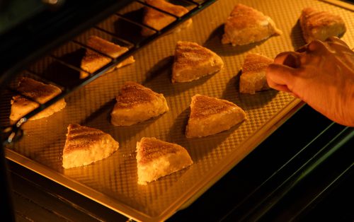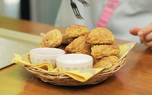 5.ทาหน้าสโคนด้วยวิปครีม ผสมน้ำตาลทรายกับผงอบเชยแล้วโรยด้านบนบาง ๆ จัดเรียงบนถาดอบ อบที่ 220 องศาเซลเซียส ประมาณ 12 นาที หรือจนหน้าสโคนขึ้นสีสวย นำออกจากเตา พักให้เย็นเล็กน้อย