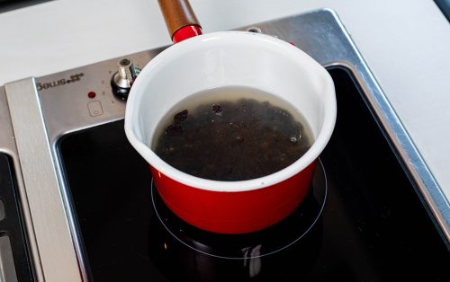 2.เตรียมลูกเกด โดยนำใส่หม้อ ใส่น้ำให้ท่วม ตั้งไฟ พอเดือด ยกออกจากความร้อน สะเด็ดน้ำ ใช้หลังทัพพีกดเบา ๆ ซับน้ำส่วนเกินออกเล็กน้อย ใส่เหล้ารัม เคล้าเบา ๆ พักให้เย็นลง