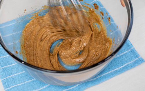 5.ตีเนย กับน้ำตาลทรายแดง และน้ำตาลทรายให้เข้ากันดี ใส่ไข่ไก่ และวานิลลา ตีต่อให้เข้ากัน