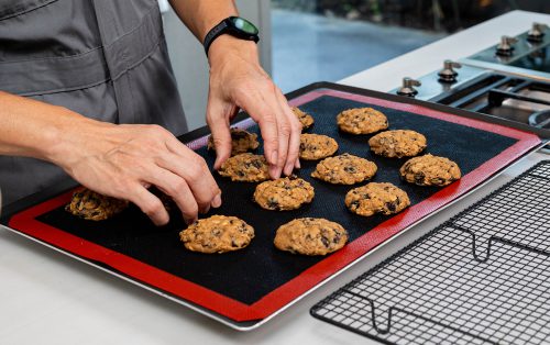 8.ใส่ข้าวโอ๊ต คนให้กระจายทั่วดี ใช้ที่ตักคุกกี้เบอร์ 30 ตักคุกกี้ลงบนถาดที่รองด้วยกระดาษไข หรือแผ่นรองอบ ทิ้งระยะห่างกันเล็กน้อย เข้าอบ 15 นาที พักบนถาด 5 นาที ก่อนย้ายมาพักต่อบนตะแกรงให้เย็นสนิท