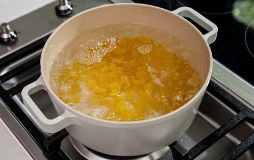 1.ตั้งน้ำสำหรับต้มเส้น ใส่เกลือ ต้มเส้นชิฟเฟอรี เป็นเวลา 7 นาที