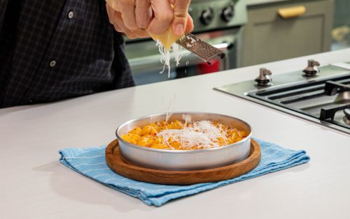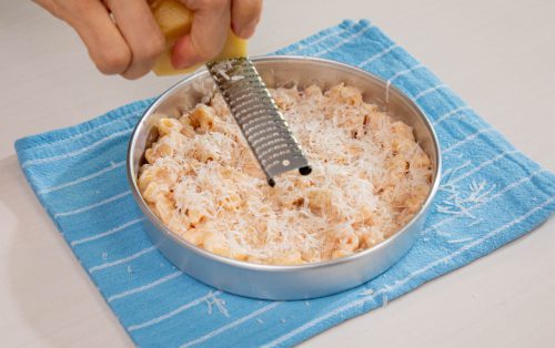 2.เคล้าเส้นพาสต้า กับพาสต้าซอสทรัฟเฟิล ซอสมะเขือเทศ วิปปิ้งครีม และพาร์มิซาน ตักใส่ในภาชนะแบนที่สามารถเข้าเตาอบได้ ขูดพาร์มิซานเพิ่ม