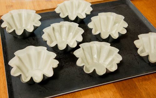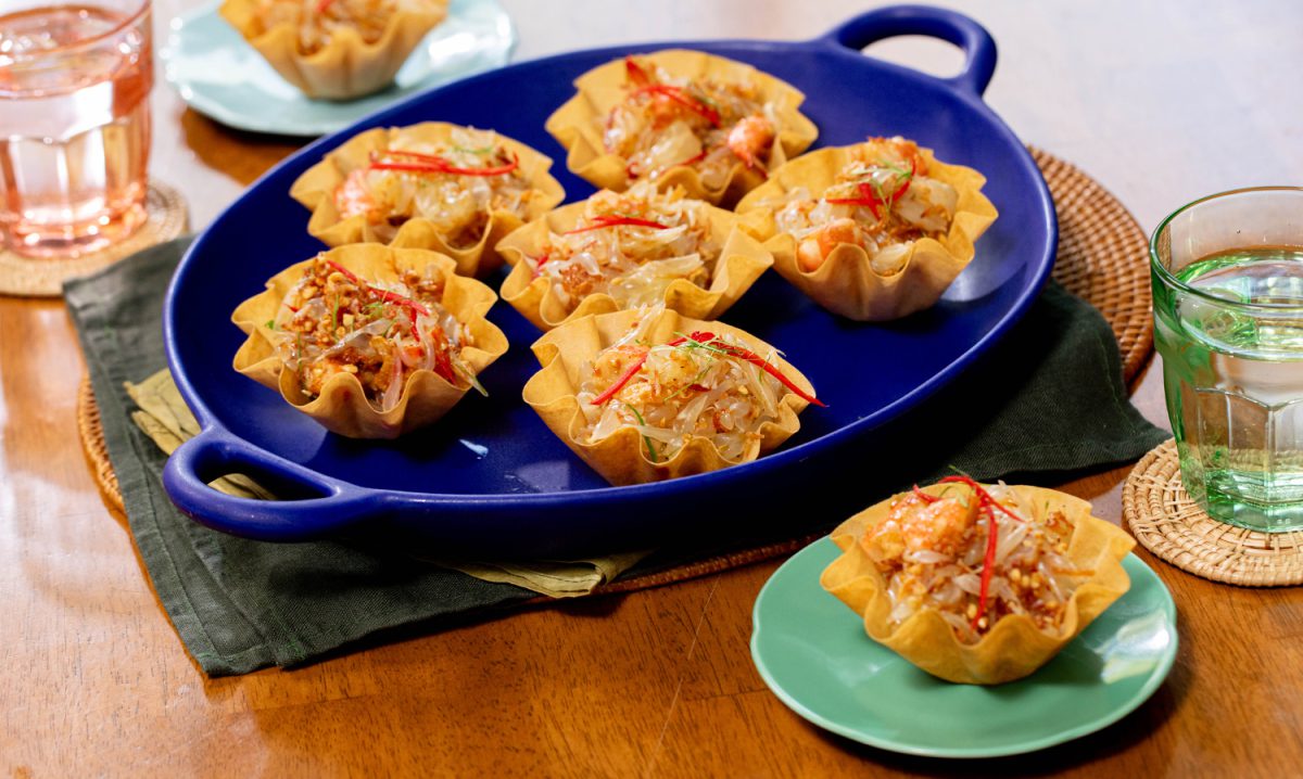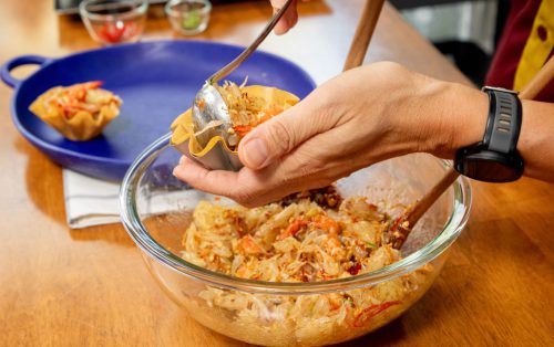 1.ทำกระทงกรอบ โดยตัดแผ่นแป้งเปาะเปี๊ยะให้เป็นวงกลม ทาน้ำมันบาง ๆ ทั้ง 2 ด้าน กรุในพิมพ์คัพเค้ก นำเข้าอบ 180 องศาเซลเซียส เป็นเวลา 10 นาที หรือจนกรอบดี