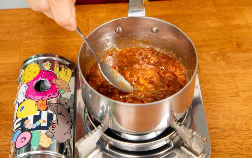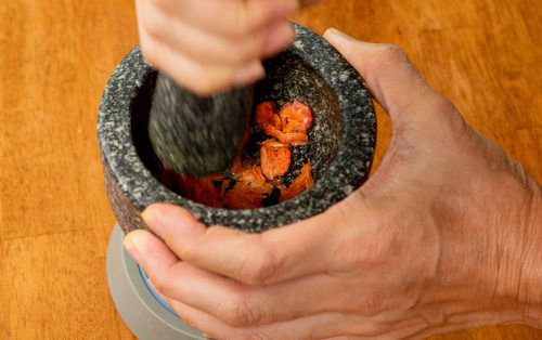 3.นำพริกแห้ง หอมแดง และกระเทียม ใส่กระทะตามด้วยน้ำสะอาดเล็กน้อย ตั้งไฟ พอน้ำระเหย คั่วส่วนผสมให้พอขึ้นสี แล้วนำไปโขลกกับเกลือให้แหลก นำใส่หม้อ พร้อมด้วยกุ้งแห้ง น้ำตาลปี๊บ น้ำมะขามเปียก และน้ำปลา ตั้งไฟ เคี่ยวให้พอข้นดี พักให้เย็นลง