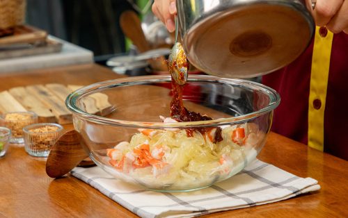 4.บิส้มโอเป็นชิ้นเล็ก ๆ ใส่ในชามผสม พร้อมกุ้งต้มหั่นชิ้น ใส่น้ำนำที่เตรียมไว้ลงไปคลุกเคล้าให้เคลือบดี