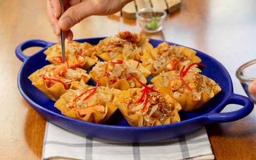 5.ใส่มะพร้าวคั่ว ถั่วลิงคั่วป่น และหอมเจียว เคล้าเบา ๆ ให้กระจายดี ใส่พริกชี้ฟ้า และใบมะกรูดซอยเล็กน้อย ตักยำส้มโอใส่ในกระทงกรอบ