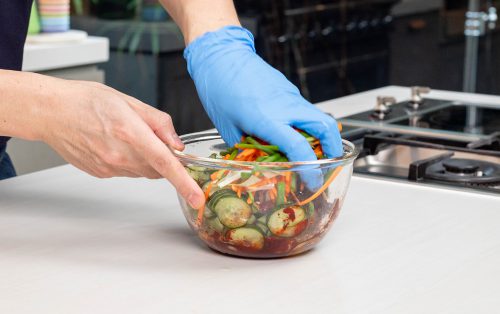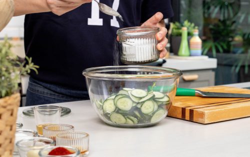 1.หั่นแตงกวาเป็นแว่น คลุกเกลือแล้ววางพักไว้ 10 นาที
