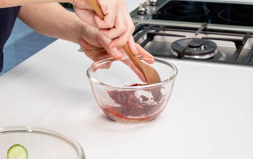 3.ผสมพริกป่นเกาหลี น้ำตาลทราย น้ำปลา น้ำส้มสายชู บดกระเทียมใส่ลงไป ผสมให้เข้ากัน ตามด้วยน้ำมันงา