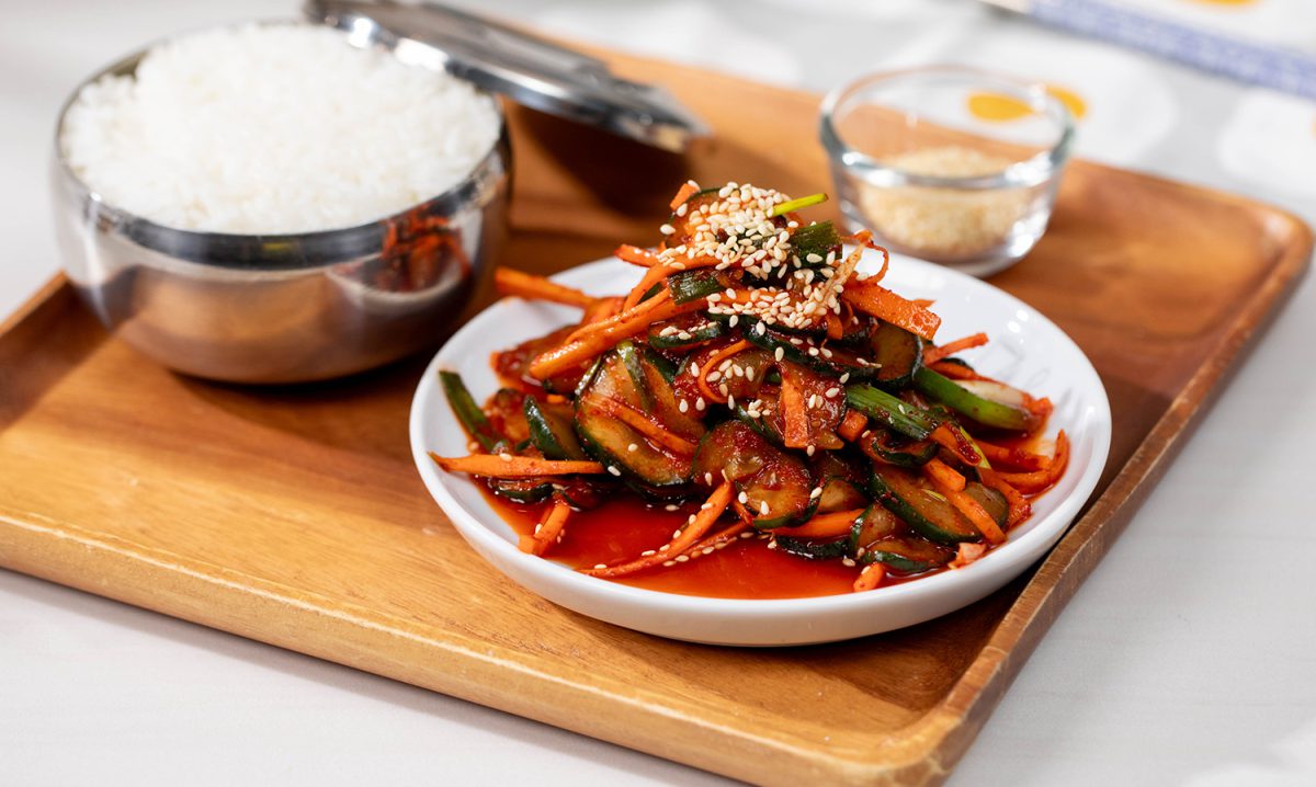 4.แตงกวาที่พักไว้จะคายน้ำออกมา ตักเฉพาะแตงกวาขึ้นมาผสมกับเครื่องปรุง แครอท และต้นหอม คลุกเคล้าให้เข้ากันดี โรยงาขาวคั่ว