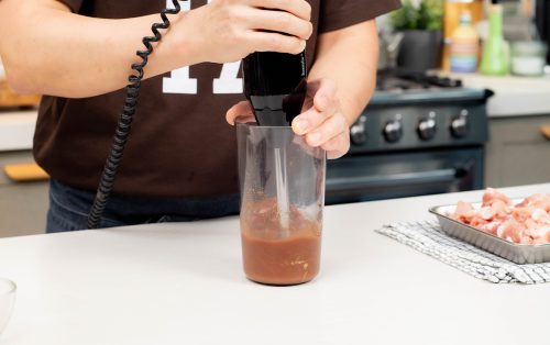 1.ปั่นโชยุ น้ำตาล น้ำมันงา ผงหมูแดง น้ำสะอาด หอมใหญ่ กระเทียม มิริน และพริกไทยดำให้เนียนเข้ากัน