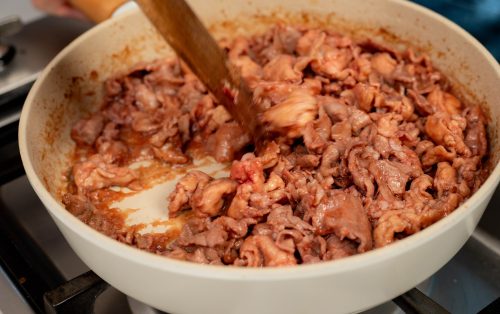 This Bulgogi variation gets its distinctive aroma and color from red pork seasoning powder, giving the dish a richer and more vibrant flavor profile. Thinly sliced pork is marinated in a savory sauce, then stir-fried until juicy and glossy. Serve with steamed Japanese rice, fresh vegetables, and ssamjang for an easy at-home Korean barbecue set.