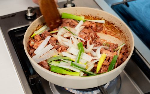 4.เมื่อหมูใกล้สุก ใส่หอมใหญ่ซอยและต้นหอมญี่ปุ่นหั่นท่อนลงผัดให้พอสลดและหอม