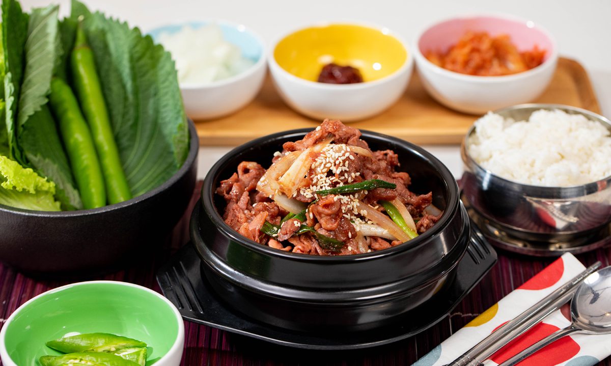 5.ตักใส่จาน โรยงาขาวคั่ว เสิร์ฟพร้อมข้าวสวย ผักสด พริกชี้ฟ้าหั่นแว่น และซัมจังตามแบบบุลโกกิชุดเกาหลี