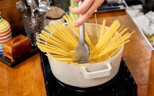 1.ตั้งน้ำสำหรับต้มเส้น ใส่เกลือ ต้มเส้นสปาเก็ตตี้ควิกคุกประมาณ 3 นาที ตักเส้นขึ้นพักไว้ พร้อมเก็บน้ำต้มเส้นไว้เล็กน้อย
