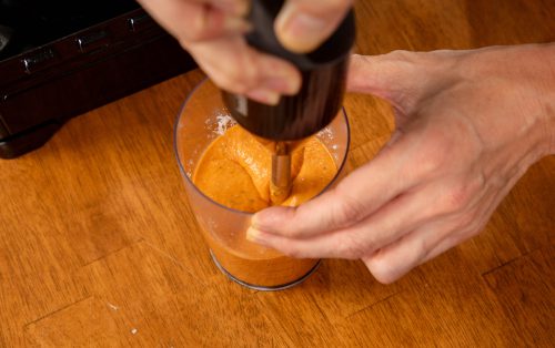 2.ใส่ซอสพาสต้ามะเขือเทศ น้ำต้มเส้น ครีมชีส และพาร์มิซานลงในเครื่องปั่น ปรุงรสด้วยเกลือและพริกไทยเล็กน้อย ปั่นจนซอสเนียนเข้ากันดี