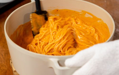 3.ใส่เส้นพาสต้าลงไปเคล้าให้ซอสเคลือบเส้นทั่วดี