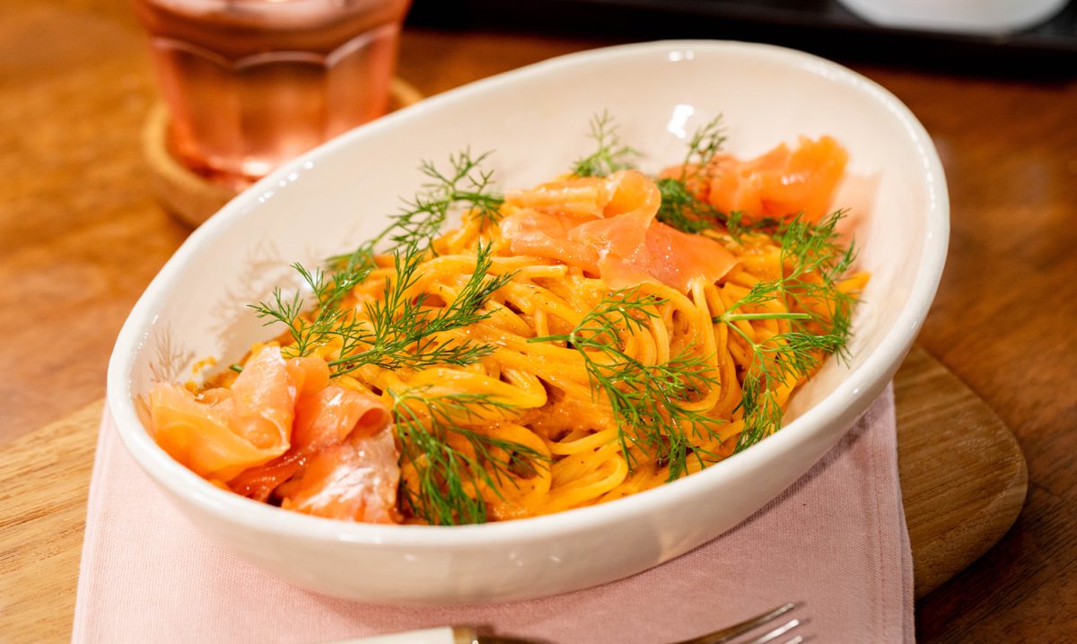 4.ตักพาสต้าใส่จานเสิร์ฟ วางแซลมอนรมควันด้านบน โรยผักชีลาว พรมด้วยน้ำมันมะกอกเล็กน้อย พร้อมเสิร์ฟทันที