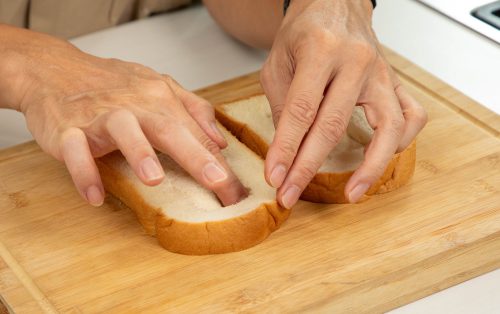 1.ใช้มีดกรีดเนื้อขนมปังเข้ามาจากขอบเล็กน้อย โดยไม่กรีดให้ทะลุ จากนั้น ใช้นิ้วกดเนื้อขนมปังหยุบลงไปเพื่อทำช่องสำหรับใส่คัสตาร์ด