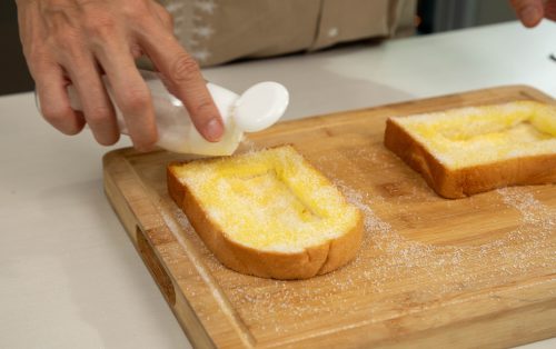 2.พรมขนมปังด้วยเนยละลายให้ทั่วดี โรยน้ำตาลทราย นำเข้าอบ 180 องศาเซลเซียส 15 นาที