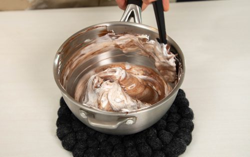4.ทำช็อกโกแลตครันชี่ โดยละลายดาร์กช็อกโกแลตและไวท์ช็อกโกแลตในไมโครเวฟครั้งละ 20–30 วินาที