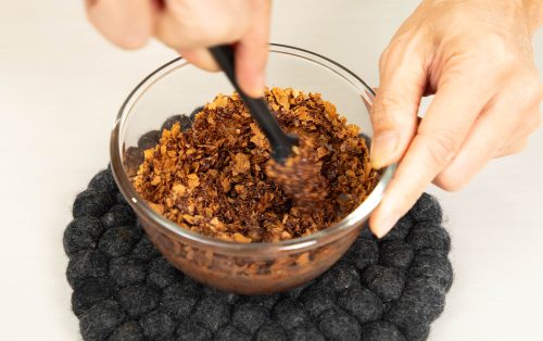 4.Melt both dark and white chocolate in the microwave in 20–30 second intervals. Add the oil and mix well. Add the feuilletine and fold gently to coat evenly.