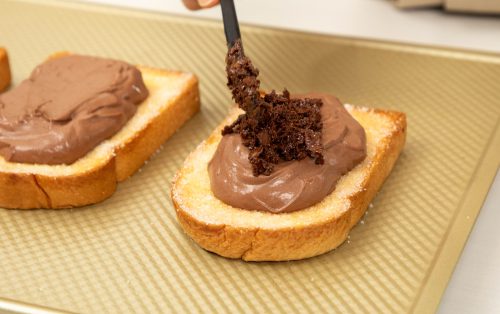 5.ประกอบโทสต์ โดยตักครีมคัสตาร์ดช็อกโกแลตลงตรงกลาง โปะช็อกโกแลตครันชี่ด้านบนให้เต็ม พร้อมเสิร์ฟ