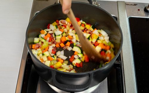 2.Meanwhile, heat olive oil in a pot. Sauté the bacon for about 3 minutes. Add onion, carrot, celery, bell pepper, zucchini, and garlic. Season with salt and cook for about 5 minutes, until the vegetables are tender.