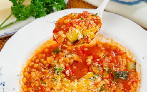 A hearty soup inspired by classic Italian vegetable soups. A variety of diced vegetables are simmered in a rich tomato broth, then barley is added to give the soup a new dimension—chewy, tender texture and satisfying substance without feeling heavy. The result is a warm, wholesome, and distinctive vegetable soup.