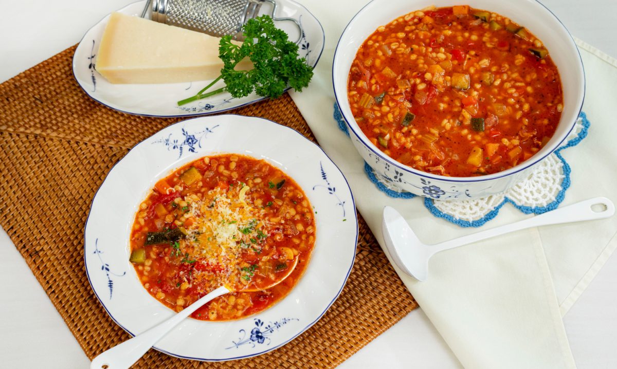 A hearty soup inspired by classic Italian vegetable soups. A variety of diced vegetables are simmered in a rich tomato broth, then barley is added to give the soup a new dimension—chewy, tender texture and satisfying substance without feeling heavy. The result is a warm, wholesome, and distinctive vegetable soup.