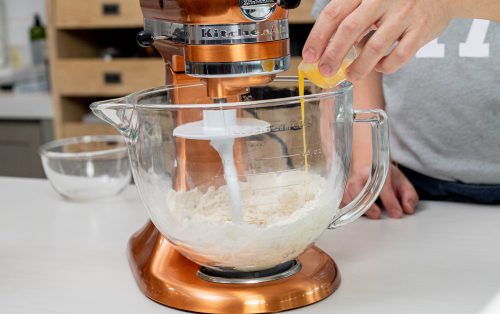 1.ผสมแป้งขนมปัง น้ำตาลทราย ยีสต์ เกลือ นมจืด และไข่ไก่ ลงในเครื่องผสม นวดด้วยสปีดต่ำจนส่วนผสมเข้ากัน