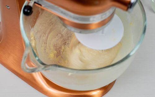 2.เพิ่มสปีดให้สูงขึ้นจนโดว์เริ่มขลึงเป็นฟิล์มขุ่นเล็กน้อย ใส่เนยลงไป แล้วนวดต่อจนโดว์เนียนและสามารถดึงเป็นฟิล์มบางใสได้