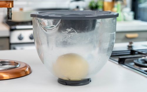 3.รวบโดว์เป็นก้อน ปิดหน้าพักไว้ 40–60 นาที หรือจนมีขนาดเพิ่มขึ้นประมาณ 2 เท่า