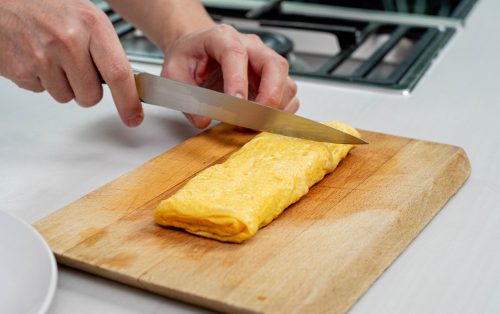 4.ตีไข่ไก่ 4 ฟองให้เข้ากัน แล้วเจียวในกระทะให้เป็นแผ่น พับเป็นทรงสี่เหลี่ยมพักไว้ให้เย็น หั่นไข่เจียวและแฮมกระป๋องให้เป็น 8 ชิ้นเท่า ๆ กัน แล้วประกบเป็นคู่สำหรับทำไส้