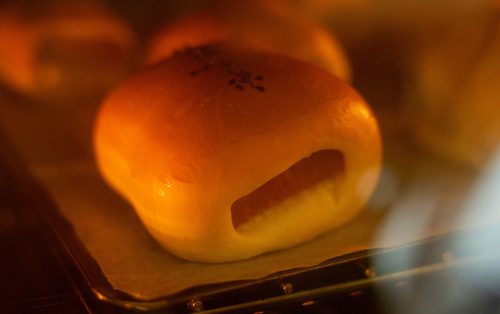 7.อบที่ 180°C ไฟบน–ล่าง ประมาณ 18 นาที หรือจนหน้าขนมปังขึ้นสีเหลืองทองหอม