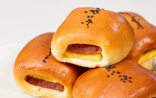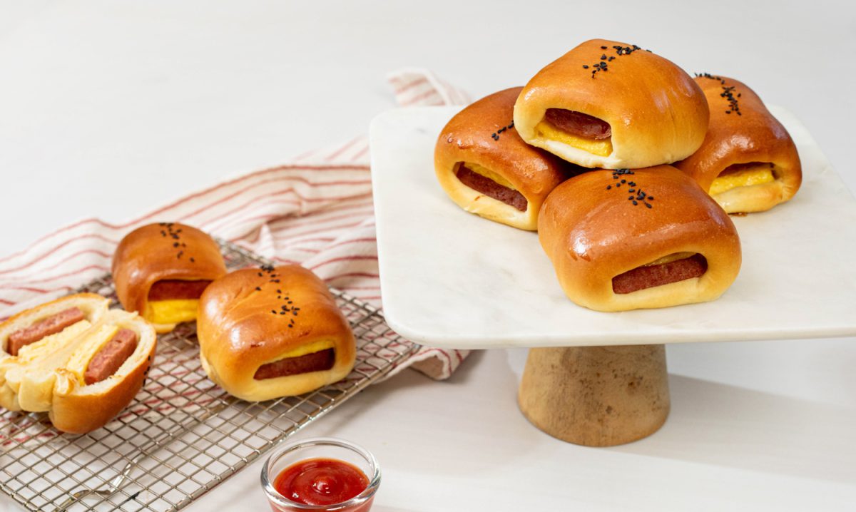 5.เมื่อโดว์หมักได้ที่ ตัดแบ่งเป็น 8 ชิ้น ชิ้นละประมาณ 45–50 กรัม รีดแต่ละชิ้นเป็นแผ่นบาง วางไส้แฮม–ไข่เจียวตรงกลาง แล้วพันโดว์ให้หุ้มไส้จนมิด
