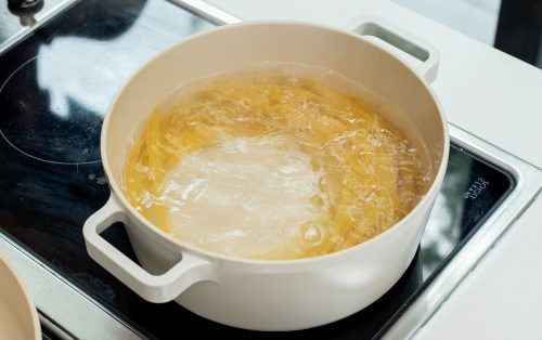 1.ตั้งน้ำสำหรับต้มเส้นพาสต้า ใส่เกลือ ต้มเส้นสปาเก็ตตี้ให้ได้ระดับ al dente ตักน้ำต้มเส้นไว้เล็กน้อย