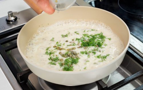 Add the pasta water to loosen, then stir in lemon juice, chopped dill, and capers.