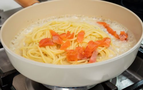 3.Add the spaghetti and diced smoked salmon.