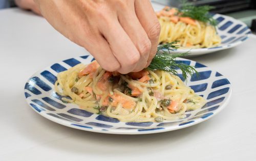 A creamy carbonara given a fresh, elegant twist ==brightened with lemon juice and dill, and enriched with the savory aroma of smoked salmon.