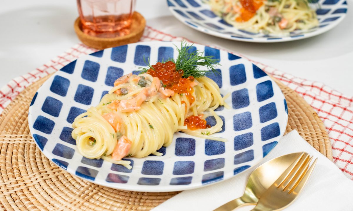 คาร์โบนาร่า ซอสขาวรสละมุน ถูกแต่งกลิ่นและรสให้สดแตกต่างด้วยน้ำเลมอนและผักชีลาว ผสมความหอมเค็มของแซลมอนรมควันและเคเปอร์ที่ช่วยตัดรสมันได้อย่างลงตัว เพิ่มความหรูหราและสัมผัสด้วยไข่ปลาแซลมอนสีสวย